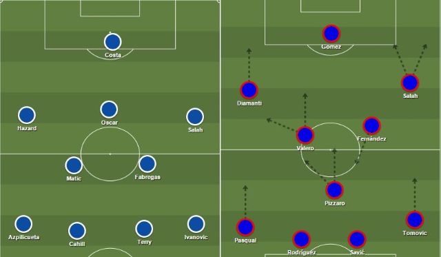 تشيلسي: يلعب تشيلسي بطريقة لعب 4-2-3-1، وصلاح يأخذ دائماً الجناح الأيسر، لكن في طريقة لعب مورينيو، لاعب الجناح يجب أن يعود كثيراً للوسط من أجل المساندة الدفاعية، وبالتالي يعتبر لاعب وسط متقدم أكثر منه مهاجم، لذلك زادت الأعباء الدفاعية على اللاعب المصري.