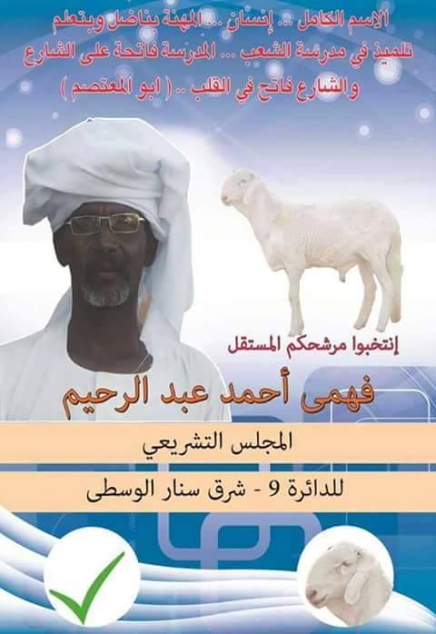 وقد ظهرت صورة خروف اعلي القائمة التي وضعها فهمي والذي يستعد لترشيح نفسه في المجلس التشريعي للدائرة 9 شرق سنار الوسطي, ولم يكتب هذا المرشح اسم الخروف والذي علي ما يبدو قد اختاره كرمز انتخابي له.