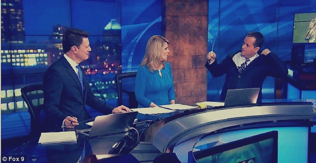 دخل مقدمو النشرة الإخبارية على «قناة فوكس 9» الأمريكية، في نوبة ضحك بعد أن سحب زميلهم مراسل النشرة الجوية، شماعة من معطفه على الهواء مباشرة، ورميها بعيدًا.