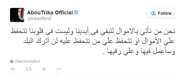 وكتب «أبوتريكة»، في تغريدة على حسابه بموقع «تويتر»، مساء الخميس: «نحن من نأتي بالأموال لتبقى في أيدينا، وليست في قلوبنا.. تتحفظ على الأموال أو تتحفظ على من تتحفظ عليه، لن أترك البلد، وسأعمل فيها وعلى رقيها».