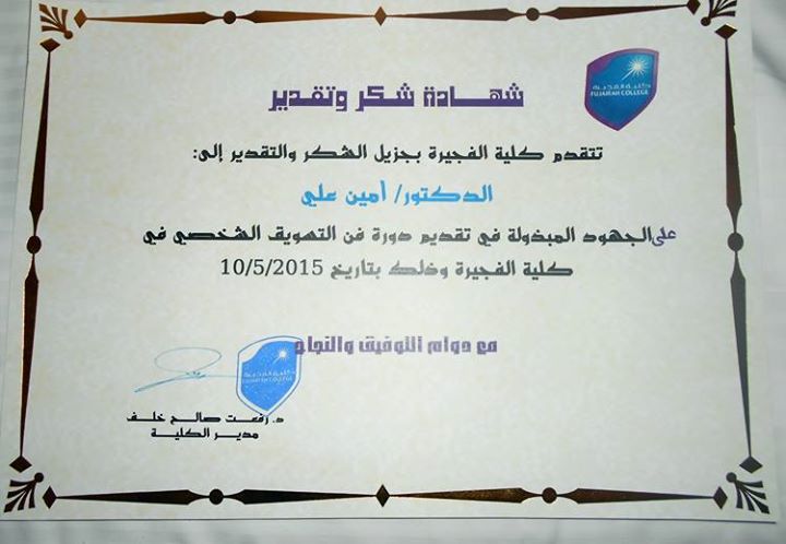 نظمت كلية الفجيرة في مقرها مساء يوم الأحد 10 مايو الجاري ورشة عمل بعنوان “فن التسويق الشخصي” قدمها مدرب التنمية البشرية وخبير الإعلام الإلكتروني ، الدكتور أمين علي عبد الرحمن والذي تطرق خلالها إلى العديد من المحاور المتعلقة بفنون كتابة السيرة الذاتية وأهميتها كوسيلة تقديم وتعريف بالنفس وأقسامها ومهارات التسويق الشخصي الحديثة وأنواع المقابلات الشخصية وكيفية الاستعداد لإجرائها وفن اجتيازها وطرق البحث عن وظيفة ملائمة.