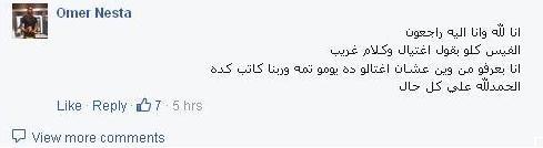 اول حاجه قبل ما اعلق ونعم بالله وقدر الله ما شاء فعل واراد الله ان يختار غسان بجواره وندعوا الله له بالرحمه والمغفره وعايز أقول الاسمه عمر دا احتمال يكون محتاج لكف قوي لانه زي ما مصدق والواحد في حالات البرود اللي زي دي احتمال يصاب بالجنون لو ما لحقوا ،، لانه من طريقه كلامه وردو على تعليقات الناس في صفحته الخاصه بالفيس تحس بيو زي طاشي وما مركز !