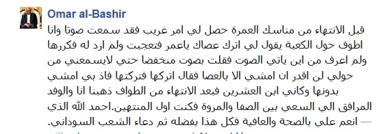 (قبل الانتهاء من مناسك العمرة حصل لي امر غريب فقد سمعت صوتا وانا اطوف حول الكعبة يقول لي اترك عصاك ياعمر فتعجبت ولم ارد له فكررها ولم اعرف من اين ياتي الصوت فقلت بصوت منخفضا حتي لايسمعني من حولي لن اقدر ان امشي الا بالعصا فقال اتركها فتركتها فاذ بي امشي بدونها وكاني ابن العشرين فبعد الانتهاء من الطواف ذهبنا انا والوفد المرافق الي السعي بين الصفا والمروة فكنت اول المنتهين.احمد الله الذي انعم علي بالصحة والعافية فكل هذا بفضله ثم دعاء الشعب السوداني).
