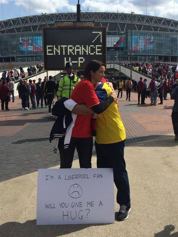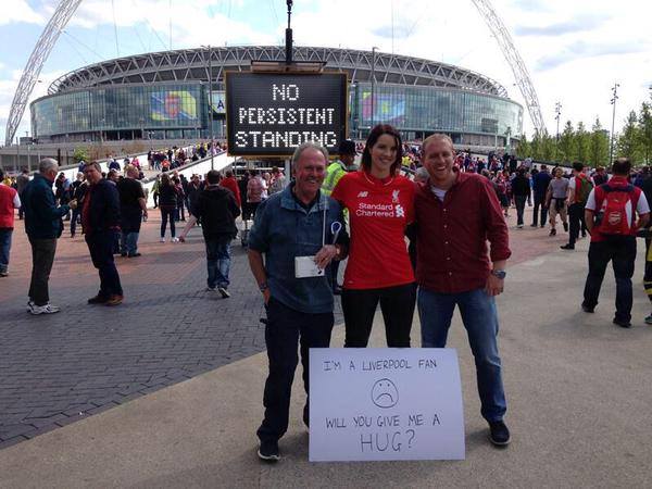 بالصورة: مشجعة لنادي ليفربول تحظي بعناق حار بعد وضعها لافتة كتبت عليها (أنا مشجعة ليفربول هل تعانقني؟؟)
