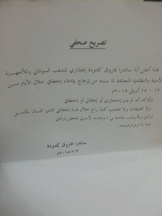 وأعلنت ساندرا في المؤتمر الذي رصدته عدد من الصحف عن إعتزارها للشعب السوداني وللأجهزة الأمنية والنظامية المختلفة لما سببته من إزعاج بإدعاء إختطافها، مؤكدة أنها لم يتم إحتجازها أو إعتقالها أوإختطافها أو التحقيق معها أوتعذيبها كما راج خلال فترة إختفائها والذي قالت أنه كان بكامل إرادتها ولأسباب خاصة بها، موضحة أنها عادت إلى اسرتها بمحض إرادتها.