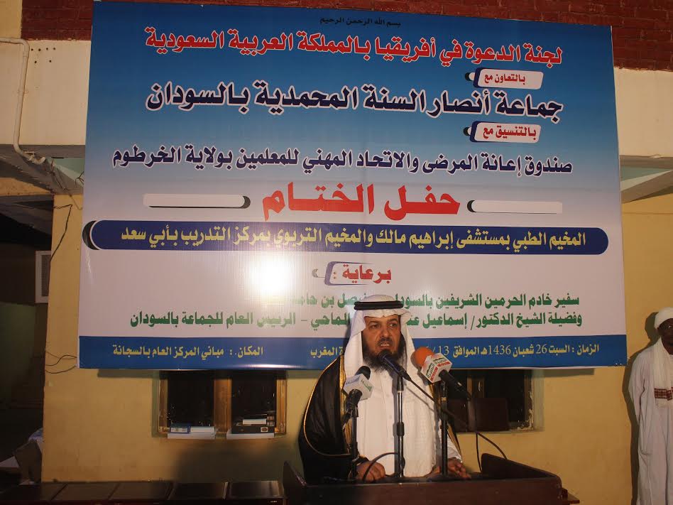 من جهته عبَّر د. عبد الله أحمد التهامي الأمين العام لجماعة أنصار السنة المحمدية بالسودان عن سعادته باختتام المخيمين ، ولفت لاستعداد الجماعة تسخير كافة اماكناتها وعلاقاتها الوطيدة بالمملكة العربية السعودية لما يخدم العباد والبلاد ، وقال التهامي إن علاقة الجماعة بالمملكة قديمة ومتجذرة منوهاً بأن الجماعة سخَّرت هذه العلاقة في الدعوة إلى الله والعمل الخيري لأهل السودان كافة . وشكر لسمو الأمير بندر بن سلمان رئيس لجنة الدعوة في إفريقيا الذي أشرف مباشرةً وتابع هذا العمل المبارك ، كما شكر وزارة الصحة وصندوق إعانة المرضى والمجلس الطبي والاتحاد المهني للمعلمين وإدارة الجمارك بمطار الخرطوم وإدارة مستشفى إبراهيم مالك و المحلس القومي للصيدلة والسموم وكل من ساهم في انجاح هذا العمل الخيِّر .