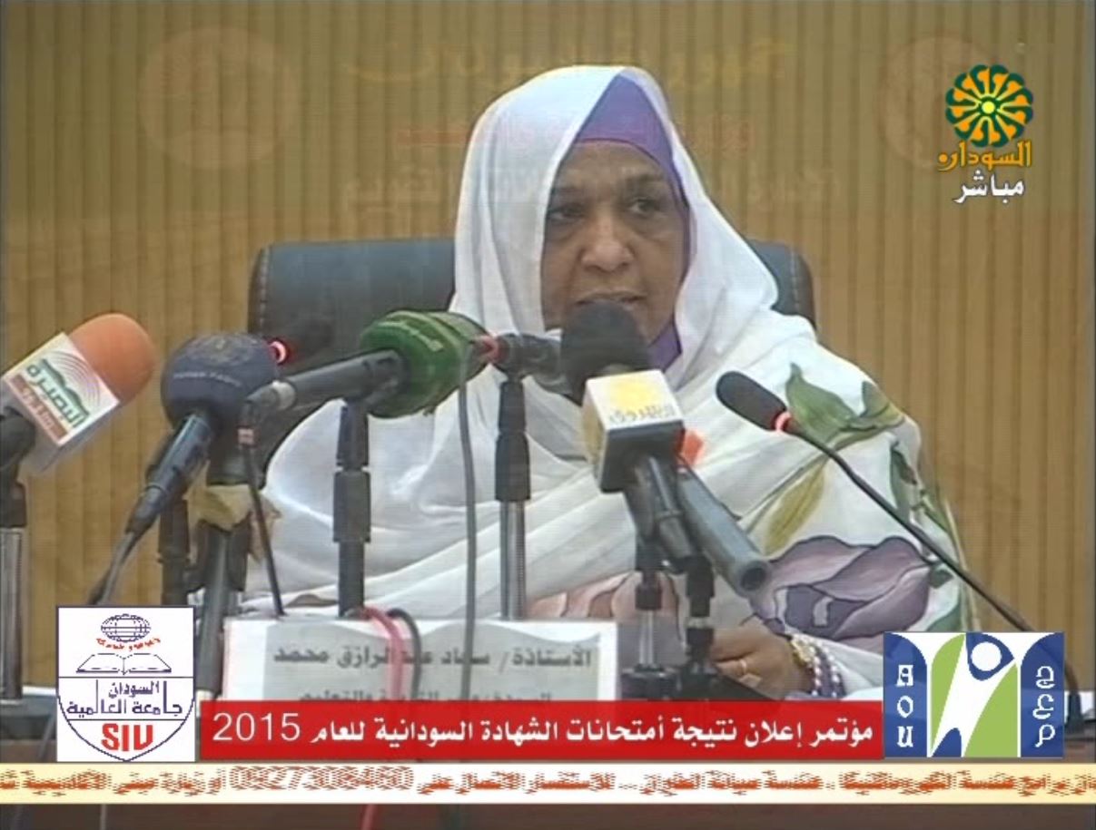 إنعقد ظهر السبت بقاعة المؤتمرات بوزارة التعليم العالي والبحث العلمي ، انعقد مؤتمر اعلان نتيجة امتحانات الشهادة الثانوية السودانية للعام 2015 ،بحضور وزيرة التربية والتعليم العام الاستاذة سعاد عبدالرازق والسيد وزير الدولة بالتربية والتعليم العام الاستاذ عبدالحفيظ الصادق ، ووكيل وزارة التربية والتعليم ومدير عام الامتحانات والتقويم ومدير الامتحانات وعدد لفيف من الوزراء و الاعلاميين والقوات النظامية والنقابات .