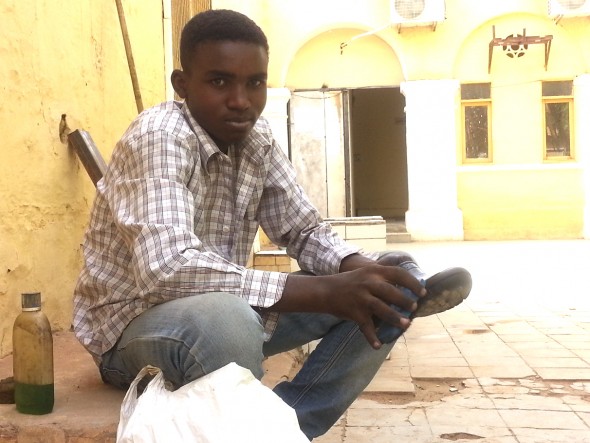 درست في الخلوة المدرسة في البلد في منطقة ديوة الدمازين ختمت القرآن بس، لكن ما حفظت منو شيء، وجيت هنا الخرطوم عشان أشتغل وما لقيت حاجة أشتغلها غير الورنيش والحمد لله هسع بكسب كويس، والقروش العندي ح أخليها تزيد عشان عاوز أشتري بهائم هناك في البلد وبيت، لكن طوااالي بفكر عاوز أرجع أقرأ تاني.