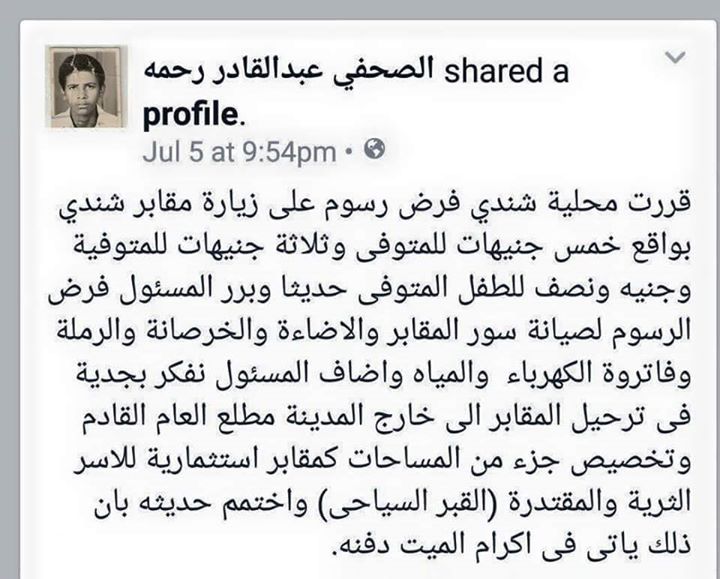 قررت محلية شندي فرض رسوم على زيارة مقابر شندي بواقع خمس جنيهات للمتوفي وثلاثة جنيهات للمتوفية وجنيه ونصف للطفل المتوفي حديثا وبرر المسئول فرض الرسوم لصيانة سور المقابر والاضاءة والخرصانة والرملة وفاتورة الكهرباء والمياه واضاف المسئو نفكر بجدية في ترحيل المقابر الى خارج المدينة
