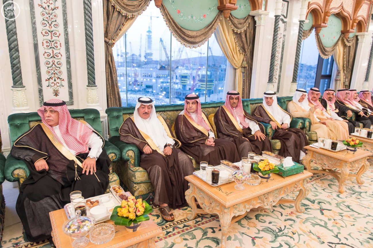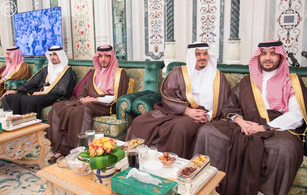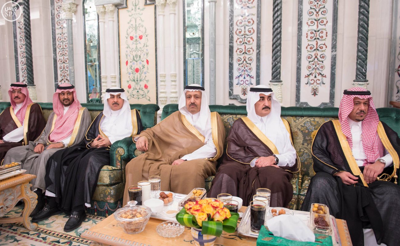 حضر الاستقبال ومأدبة الإفطار صاحب السمو الأمير فيصل بن تركي بن عبدالله ، وصاحب السمو الملكي الأمير منصور بن سعود بن عبدالعزيز ، وصاحب السمو الملكي الأمير طلال بن سعود بن عبدالعزيز ، وصاحب السمو الأمير فهد بن عبدالله بن عبدالعزيز بن مساعد ، وصاحب السمو الأمير تركي بن عبدالله بن محمد مستشار خادم الحرمين الشريفين ، وصاحب السمو الملكي الأمير سطام بن سعود بن عبدالعزيز ، وصاحب السمو الملكي الأمير سلطان بن سلمان بن عبدالعزيز رئيس الهيئة العامة للسياحة والتراث الوطني ، وصاحب السمو الأمير الدكتور مشعل بن عبدالله بن عبدالعزيز بن مساعد أمير منطقة الحدود الشمالية ، وصاحب السمو الملكي الأمير محمد بن نايف بن عبدالعزيز ولي العهد نائب رئيس مجلس الوزراء وزير الداخلية ، وصاحب السمو الملكي الأمير نهار بن سعود بن عبدالعزيز ، وصاحب السمو الأمير خالد بن سعود بن خالد مساعد وزير الخارجية ، وصاحب السمو الملكي الأمير الدكتور حسام بن سعود بن عبدالعزيز ، وصاحب السمو الأمير سعد بن عبدالله بن عبدالعزيز بن مساعد ، وصاحب السمو الأمير الدكتور بندر بن سلمان بن محمد ، وصاحب السمو الملكي الدكتور عبدالعزيز بن سطام بن عبدالعزيز مستشار خادم الحرمين الشريفين ، وصاحب السمو الأمير عبدالرحمن بن عبدالله بن فيصل محافظ المجمعة ، وصاحب السمو الأمير تركي بن خالد بن عبدالله ، وصاحب السمو الملكي الأمير تركي بن محمد بن فهد بن عبدالعزيز ، وصاحب السمو الملكي الأمير محمد بن عبدالرحمن بن عبدالعزيز ، وصاحب السمو الملكي الأمير عبدالعزيز بن سعود بن نايف بن عبدالعزيز ، وصاحب السمو الملكي الأمير سعود بن سلمان بن عبدالعزيز ، وصاحب السمو الأمير فهد بن خالد بن سعود بن خالد ، وأصحاب المعالي الوزراء.