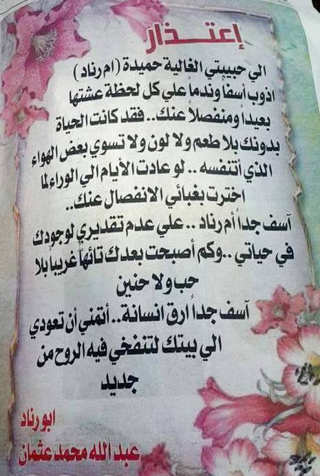 ونشر ( أبورناد ) بالصحيفة معلناً عن إعتذاره على الملأ قائلاً ( إلى حبيبتي الغالية ام رناد .. أذوب أسفاً وندماً على كل لحظة عشتها بعيداً ومنفصلاً عنك .. فقد كانت الحياة بدونك بلاطعم ولا لون ولاتسوى بعض الهواء الذي أتنفسه .. لوعادت الأيام إلى الوراء لما اخترت بغبائي الانفصال عنك .. آسف جداً أم رناد على عدم تقديري لوجودك في حياتي .. وكم أصبحت بعدك تائهاً غريباً بلاحب ولاحنين .. آسف جداً أرق إنسانه .. أتمنى أن تعودي إلى بيتك لتنفخي فيه الروح من جديد ) على حد قوله .
