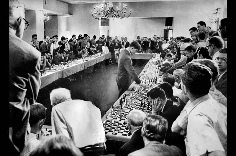 نشرت صحيفة لوس أنجلوس تايمز عام 1964 خبرًا عن بوبي فيشر لاعب الشطرنج، ذو الـ21 عامًا من بروكلين، الذي واجه 50 لاعبًا للشطرنج في جلسة واحدة