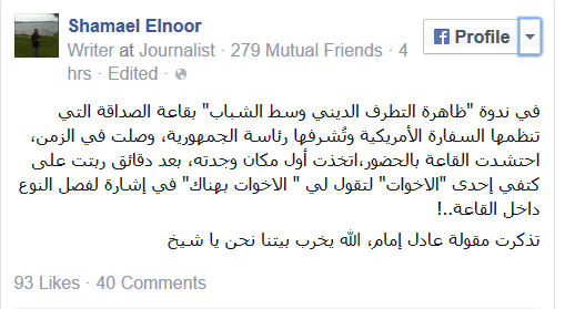 قالت الصحفية شمائل النور بحسب رصد محرر النيلين “وصلت في الزمن، إحتشدت القاعة بالحضور،إتخذت أول مكان وجدته، بعد دقائق ربتت على كتفي إحدى “الأخوات” لتقول لي ” الأخوات بهناك” في إشارة لفصل النوع داخل القاعة..! وقالت شمائل النور(والله ما قدرت امسك نفسي من الضحك، اجي يا التطرف).