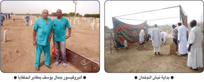 بحضور ذوي الراحل الموظف بالسفارة البريطانية عمر ابكر سليمان الذي عثر عليه متوفي دخل منزله بالسامراب بمنطقة بحري في ظروف غامضة وكان ذلك في يوم 24/8/2015 وبامر نبش للقبر من نيابة بحري شمال تحرك البروف جمال يوسف يرافقه تقني المشرحة الي مقابر الحلفايا لنبش قبر الموظف بالسفارة البريطانية وبحضور ذويه ونيابة بحري شمال مولانا عاطف ومولانا موسي ومولانا اماني حمزة وبحضور ذوي المتوفي عمه محمد يعقوب وخاله احمد ابراهيم وعدد كبير من افراد اسرته وبحضور مكثف لشعبة مباحث الدروشاب حيث قامت شرطة الدروشاب بتامين كامل لقبر المرحوم عندها قام البروف جمال يوسف بنبش القبر وسط حراسة امنية مشددة وعمل كافة الاجراءات الفنية بعد استخراج جثة المتوفي من القبر وذلك لمعرفة اسباب الوفاة كما كان لشرطة مسرح الجريمة بمحلية بحري دور كبير لحظة نبش القبر وقد بذل الفريق الطبي بمشرحة امدرمان برئاسة البروف جمال يوسف مجهودات مقدرة لمعرفة اسباب الوفاة بعدما طالبت اسرة الشاب المرحوم بنبش قبر ابنهم المتوفي مرة اخري بعد ان شكوا في اسباب وفاته داخل المنزل ولوضع حد للشكوك قاموا بمخاطبة النيابة لاعادة نبش قبر ابنهم المتوفي.