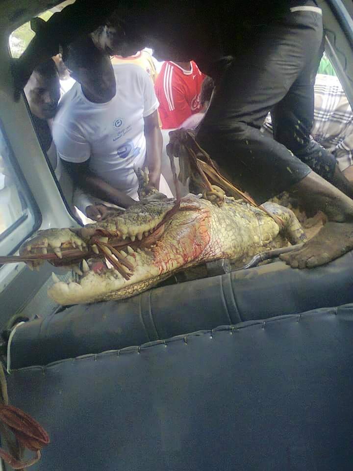 تداول رواد صفحات التواصل الإجتماعي صوراً تظهر مجموعة من السودانيين قاموا بإصطياد تمساح ضخم بمنطقة جبل أولياء (شاطئ النيل الأبيض)بأمدرمان إحدى مدن العاصمة السودانية الخرطوم حيث قامت المجموعة بطبخ وشواء لحم التمساح وإستمتعوا بوجبة دسمة.