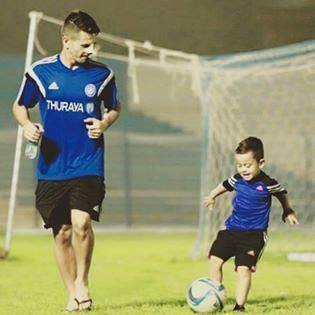 وظهر محترف الهلال وهو يدرب طفله الصغير علي كرة القدم حيث ظهر الطفل وهو يلامس الكرة ويحاول تسديدها.