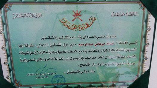 كرمت الحكومة العمانية ممثلة في المدعي العام المواطن السوداني أسامة ميرغني عبدالرحيم(من مواطني شمبات) وأشادت به لكشفه لفسادفي مؤسسة للمنتجات النفطية
