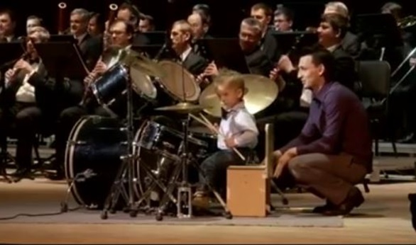 بالفيديو.. طفل عمره 3 سنوات يعزف مع أوركسترا بطريقة رائعة وطريفة