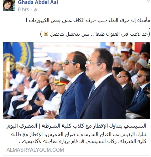 نشرت صحيفة “المصري اليوم” يوم الجمعة في مصر، خبرا بعنوان “السيسي يتناول إفطاره مع كلاب كلية الشرطة”، على موقعها الإلكتروني، ثم عدلت الخبر بسرعة وجعلت عنوانه ” السيسي يتناول الإفطار مع طلاب كلية الشرطة”.