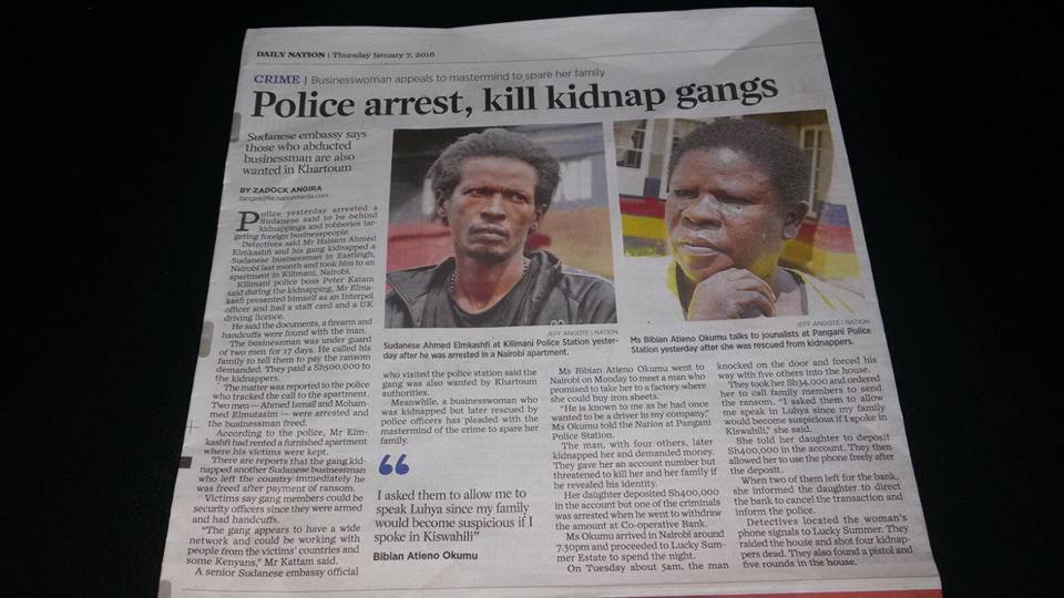 وادخلوه في حراسة في شقة استأجروها لتنفيذ اغراضهم الدنيئة واستمر الحبس لمدة ١٧ يوما او تزيد وتمكن الضحية من الافلات من قبضتهم وابلغ السفارة السودانية التي بدورها أبلغت الأجهزة الأمنية وبالتعاون مع العقيد الدومة في رئاسة الشرطة الجنائية الدولية لدول شرق ووسط افريقيا حيث مقرها بنيروبي تم القبض على هؤلاء المنفلتين وانتشر الخبر على جميع وسائل الاعلام المسموعة والمرئية الكينية ومن هؤلاء المتهمين الثلاثة ،محمد المعتصم وهيثم احمد المكاشفي وهم اشقاء واحمد اسماعيل الدومة ادم.