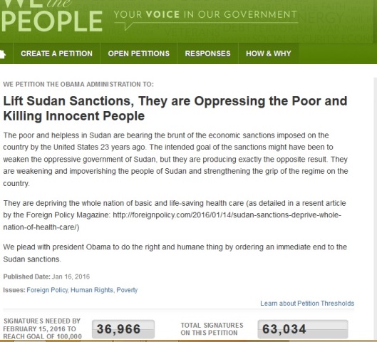 الجدير بالذكر أن عنوان عريضة رفع العقوبات عن السودان على موقع البيت الأبيض بعنوان(رفع العقوبات عن السودان ، هي اضطهاد للفقراء و قتل للأبرياء)، (Lift Sudan Sanctions, They are Oppressing the Poor and Killing Innocent People).