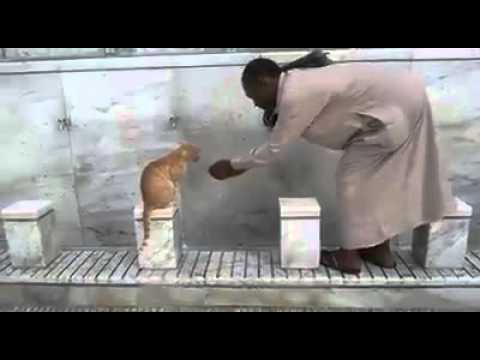 ويبدو بالفيديو قطة تقف على مقعد بمنطقة الوضوء في المسجد الحرام؛ حيث يقوم الرجل بسقيها الماء بيديه إلى أن ترتوي.