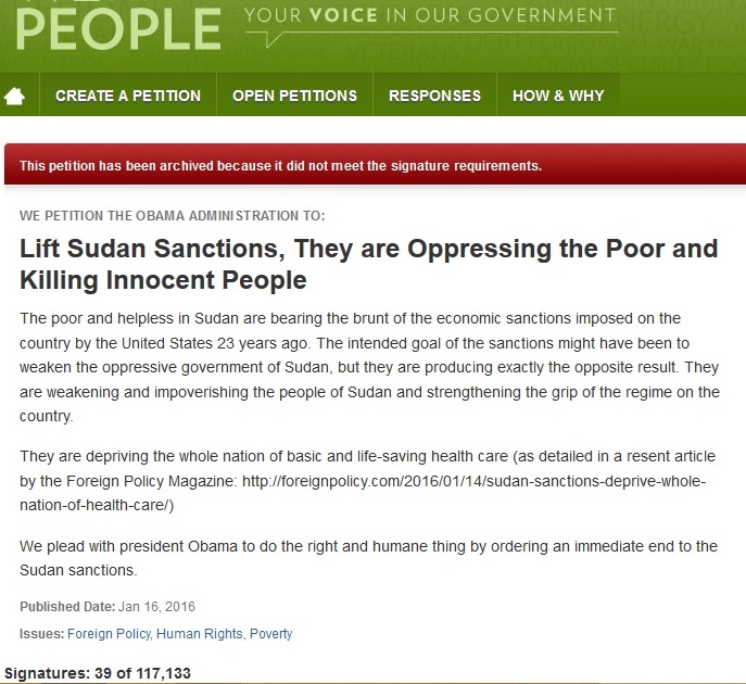 (This petition has been archived because it did not meet the signature requirements)، بهذه العبارة ختم يوم الثلاثاء البيت الأبيض الأمريكي موضوع العريضة التي يقول عنوانها على موقعه في الإنترنت (رفع العقوبات عن السودان ، هي اضطهاد للفقراء و قتل للأبرياء، (Lift Sudan Sanctions, They are Oppressing the Poor and Killing Innocent People).