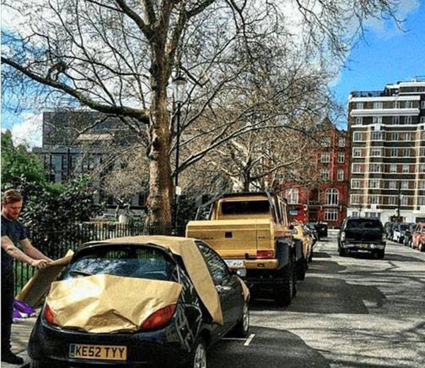 قام شاب بريطاني يدعى روبيرت ريشموند دود بركن سيارته الصغيرة فورد “كي أ” خلف أسطول سيارات ذهبية تعود ملكيتها لملياردير سعودي، كانت مركونة في أحد شوارع العاصمة لندن، وذلك حتى يبدو مظهرها الخارجي وكأنها سيارة فارهة أيضا مطلية بالذهب على غرار سيارات الثري السعودي والتي أثار ظهورها في العاصمة البريطانية مؤخرا اهتمام وسائل الإعلام العالمية. ونشر ريشموند دود صورة ساخرة لنفسه وهو يغلف سيارته المتواضعة معلقا: “مواكبة نمط الحياة في منطقة نايتسبريدج (الفخمة) ليس أمرا سهلا”.