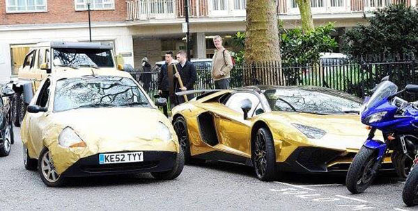 قام شاب بريطاني يدعى روبيرت ريشموند دود بركن سيارته الصغيرة فورد “كي أ” خلف أسطول سيارات ذهبية تعود ملكيتها لملياردير سعودي، كانت مركونة في أحد شوارع العاصمة لندن، وذلك حتى يبدو مظهرها الخارجي وكأنها سيارة فارهة أيضا مطلية بالذهب على غرار سيارات الثري السعودي والتي أثار ظهورها في العاصمة البريطانية مؤخرا اهتمام وسائل الإعلام العالمية. ونشر ريشموند دود صورة ساخرة لنفسه وهو يغلف سيارته المتواضعة معلقا: “مواكبة نمط الحياة في منطقة نايتسبريدج (الفخمة) ليس أمرا سهلا”.