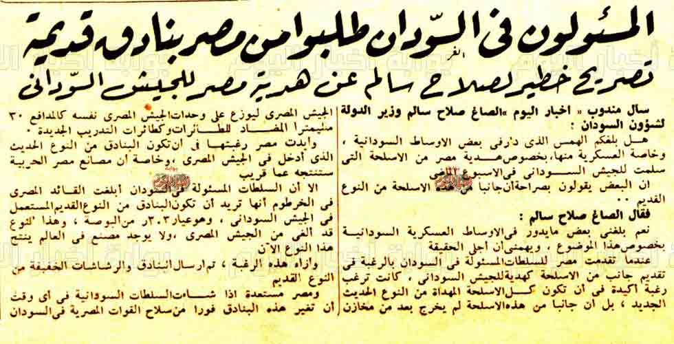 أكد وزير الدولة لشئون السودان الصاغ صلاح سالم ، لمراسل أخبار اليوم ، أن ما يدور في الأوساط السياسية على أن مصر قدمت هدية للسودان اسلحة بعضها من النوع القديم صحيح تماماً.