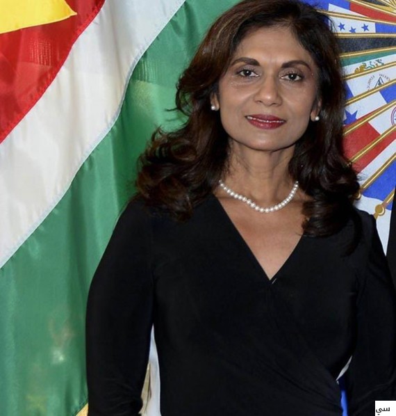 نيرمالا بادريسينغ وزير خارجية جمهورية سورينام كانت هي تلك المرأة الوحيدة الواقفة رفقة طابور من الرجال في الصورة، بلادها توجد على الخريطة في أميركا الجنوبية، وهي الدولة الوحيدة التي تنطق باللغة الهولندية في القارة اللاتينية، تحدها من الجنوب البرازيل ومن الشمال المحيط الأطلسي.