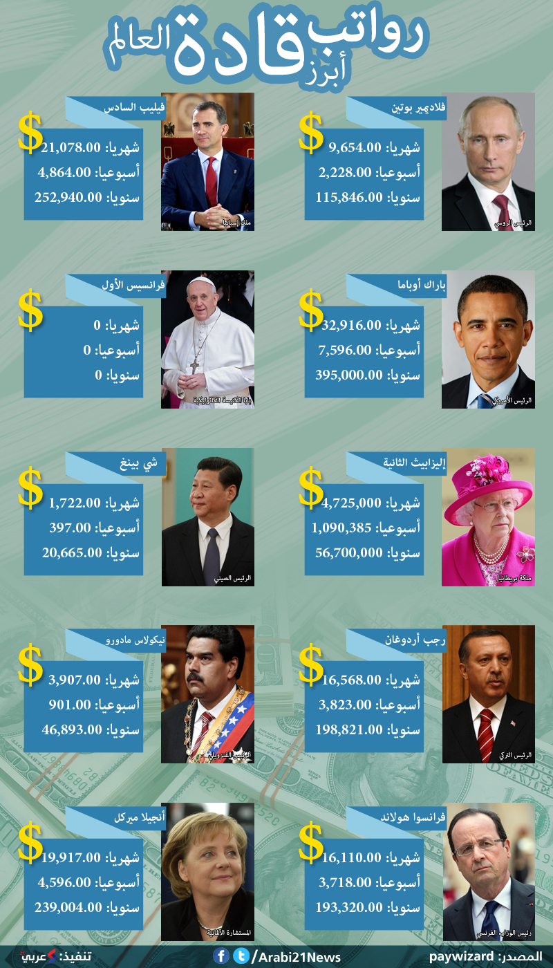 تعرف على رواتب زعماء العالم.. البابا أزهدهم 2016/04/24 تتفاوت رواتب زعماء العالم حسب البلد الذي يحكمونه، وأحيانا حسب الوظيفة التي يؤديها، فمنصب الرئيس قد يكون شرفيا في بعض البلاد، ولكنه في أماكن أخرى منصب حساس. وفيما يلي رواتب بعض أبرز زعماء العالم بحسب ما تابعت “عربي21” عربي21 مقالات ذات صلة القاهرة تحذر من بناء سدود جديدة على النيل: سنرد مقابل الاعتراف.. هل وافقت صوماليلاند على استقبال سكان غزة؟ ماسك يحذر من تحول الولايات المتحدة إلى دولة ديكتاتورية ويحدد السبب! مصر تؤكد دعمها الكامل لوحدة وسيادة الصومال للمسافرين من قطر والقادمين.. معلومات يجب معرفتها عن حالات تقديم الإقرار الجمركي وعقوبة الامتناع مصر توجه رسالة إلى “السد الإثيوبي”: “لكم بالمرصاد” “11.9 مليون مرة”.. إجمالي عدد مرات أداء العمرة في شهر جمادى الآخرة وزير الداخلية التركي يكشف تفاصيل اختفاء طائرة رئيس أركان الجيش الليبي