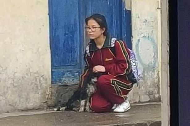 التقط أحد الأشخاص صورة ملهمة من مدينة هوانكايو في بيرو لطالبة تجلس على الطريق لإيواء جرو صغير من الأمطار الغزيرة.