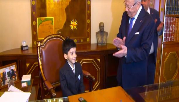 محمود طفل تونسي، لم يتجاوز الـ5 أعوام، تمكن مؤخراً من تحقيق أمنيته في أن يصبح رئيساً لتونس، وأن يجلس في مكتب الرئيس، والتجول في قصر قرطاج، ثم المغادرة بسيارة رئاسية.