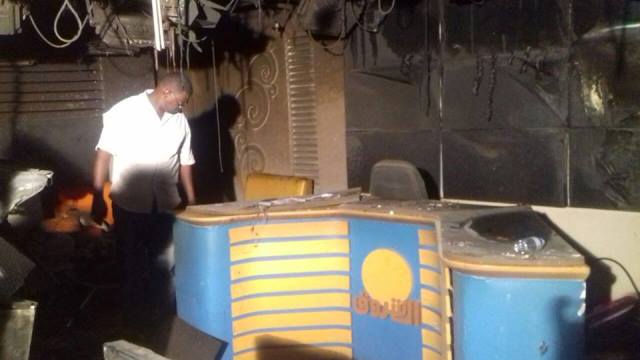 وكان الحريق قد شب باستديو الاخبار نتيجة التماس كهربائي مما تسبب في أضرار جسيمة للاستديو والكاميرات دون حدوث خسائر في الأرواح .