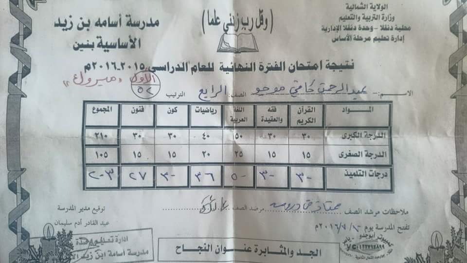 وختم مدثر تدوينه مع الصور وقال (اليوم الصباح كان علي وعده وأحضر لي الشهادة وفعلا هو في رابعة وطلع أول الفصل ودرجاته جيدة جدا.. المهم انا وزملائي حفزناه وشجعناه ان يجتهد في السنين القادمة اكتر واكتر وعدنا وانطلق في حال سبيله) .