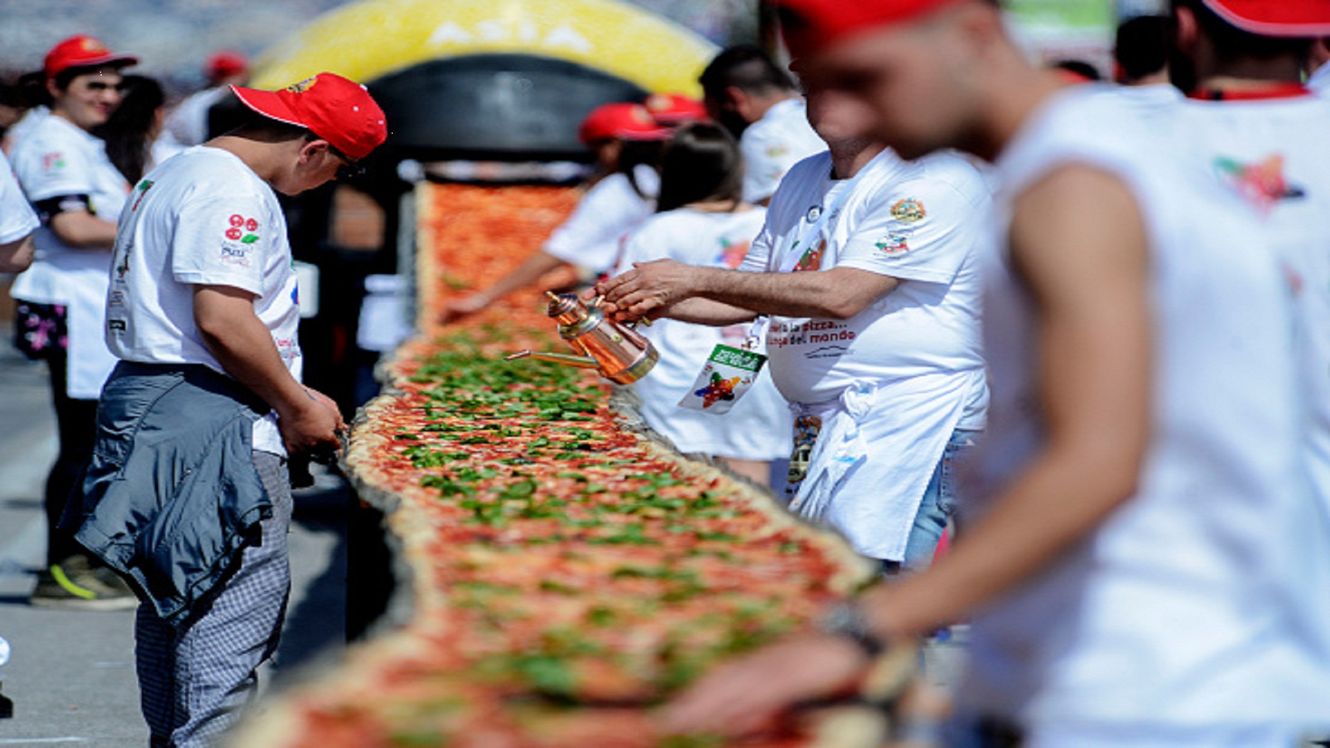 صنعت أطول بيتزا في العالم قبل أيام في إيطاليا بنابليس، وبلغ طولها 1.8 كيلو متر، وعمل على تجهيزها 250 شخصا من صناع البيتزا، واحتاجوا إلى ست ساعات عمل و 11 دقيقة.