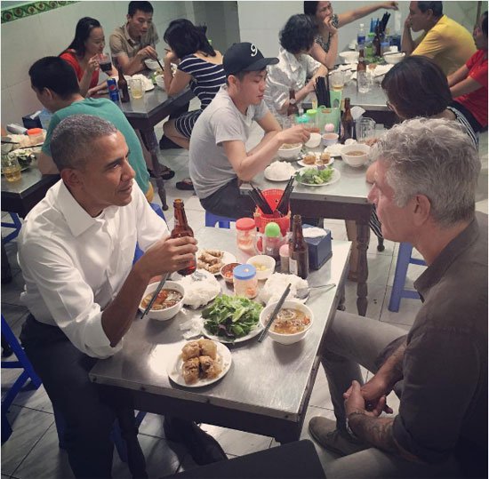 بالصور:أوباما يتناول العشاء مع الكاتب أنتوني بوردين بمطعم شعبي بفيتنام دون حراسة