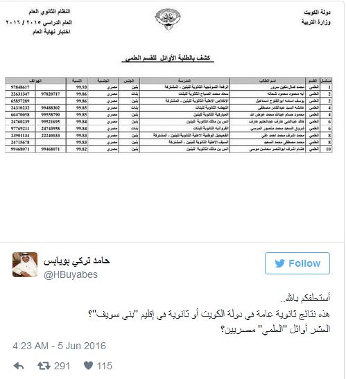 وقام بإعادة نشر النتيجة وعلق قائلاً: «أستحلفكم بالله.. هذه نتائج ثانوية عامة في دولة الكويت أو ثانوية في إقليم بني سويف؟ العشر أوائل العلمي مصريين؟».