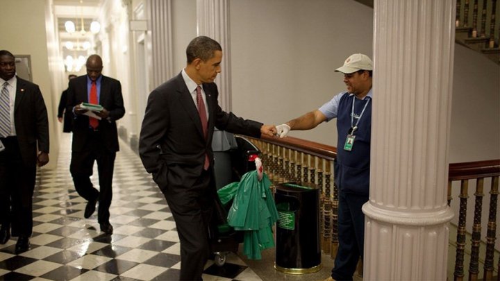 وتكشف هذه الصور شيء من الجانب الإنساني للرئيس الأمريكي الذي سيغادر البيت الأبيض قريبا، ويظهر في إحداها ضاحكا يداعب طفلة صغيرة، وأخرى يظهر فيها يحيي أحد عمال النظافة بطريقة الشبان المراهقين من أبناء الأحياء الشعبية.