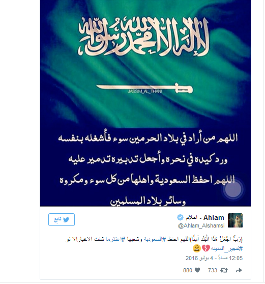 ونشرت أحلام صورة التفجير عبر صفحتها وعلقت قائلة: “﴿ رَبِّ اجْعَلْ هَذَا الْبَلَد آمِنًا ﴾ اللهم احفظ السعودية من كيد الأعداء واحفظ اَهلها وزوارها وحماتها اللهم من اراد ببلاد الحرمين سوء فأشغله في نفسه ورد كيده في نحره واجعل تدبيره تدميره اللهم احفظ السعوديه واهلها من كيد الكائدين وحسبي الله ونعم الوكيل اعتذر ما شفت الاخبار الا تو”.