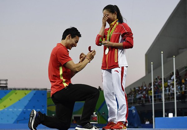 شهدت مراسم التتويج بميداليات الغطس من السلم المتحرك على ارتفاع 3 أمتار للسيدات في ريو حدثا طريفا حيث قبلت الصينية هي زي الفائزة بالميدالية الفضية خاتم الخطوبة.