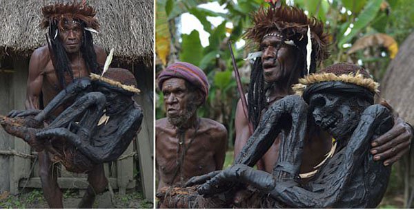 وظهر رئيس قبيلة “داني” يحمل جثة أحد الأجداد وهي محنطة بالدخان وسط طقوس احتفالية من أبناء القبيلة التي اكتشفها للمرة الأولى عن طريق الصدفة الباحث الأمريكي ريتشارد أرشبولد عام 1938.
