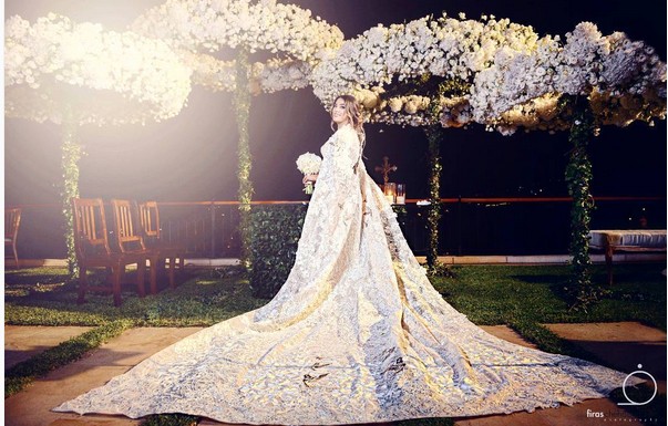 وأطلت العروس بفستان زفاف من تصميم المصمم اللبناني حسين بظاظا، وقاما العروسان بدعوة 200 شخص من الأصدقاء والمقربين والمشاهير.