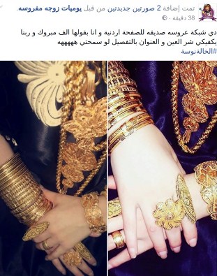 وأظهرت صورتي شبكة العروس التي تحتوي على عدد كبير من الأساور والسلسال والخواتم الضخمة، ما أثار غيرة وغضب الفتيات المصريات.