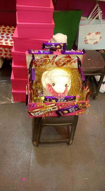 وأظهرت الصور التي التقطتها أحد الأشخاص داخل محل الهدايا صندوقا يوجد به دمية على شكل خروف والعديد من قوالب الشيكولاتة، ولم يكتف بذلك بل وضع ألف جنيه عيدية لحبيبته.