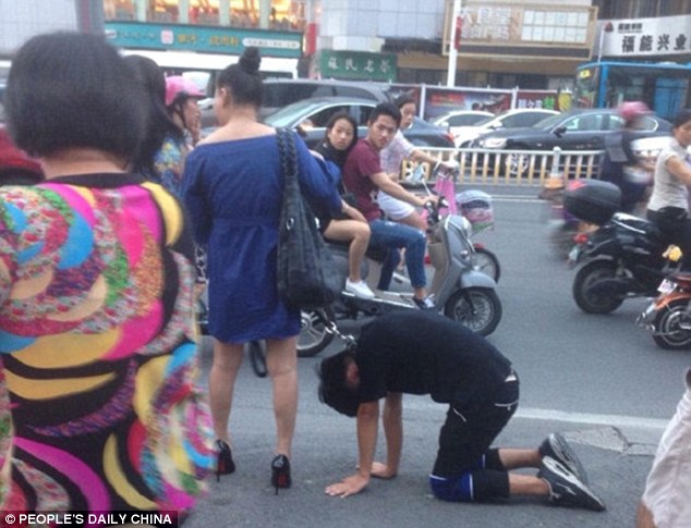 واحتشد العشرات من المارة في أحد شوارع مدينة فوتشو بمقاطعة فوجيان الصينية، لمشاهدة المرأة، وهي تجر الرجل الذي كان يزحف على يديه ورجليه في الشارع، مما تسبب بتوقف حركة المرور في المنطقة.