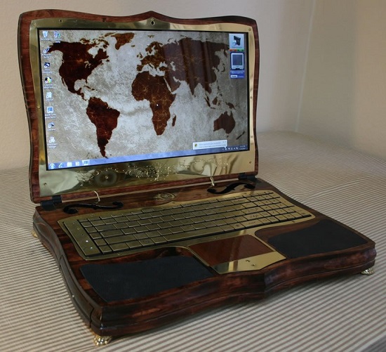 يتميز هذا اللاب توب بتصميمه الغريب الذى يشبه الأثريات، بفضل مظهره العتيق وتصميمه الخشبى.