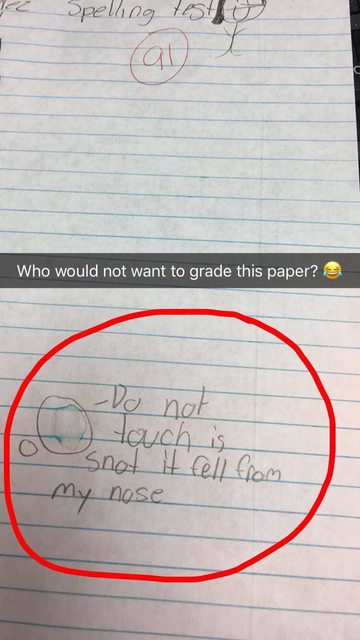 نشر صديق المعلم صورة لورقة الاختبار على موقع رديت مع تعليق: من لا يود تصحيح هذه الورقة؟، وتعمد الطالب وضع دائرة لتحديد البقعة وكتب ” لا تلمس هذه البقعة.. فهي مخاط سقط من أنفي”.