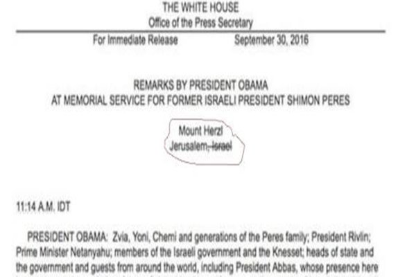 صحّحت إدارة البيت الأبيض النص الرسمي لنعي الرئيس الأميركي باراك أوباما للرئيس الإسرائيلي السابق شيمون بيريز يوم الجمعة 30 سبتمبر 2016، بحذف إشارة لكون القدس جزءاً من إسرائيل.